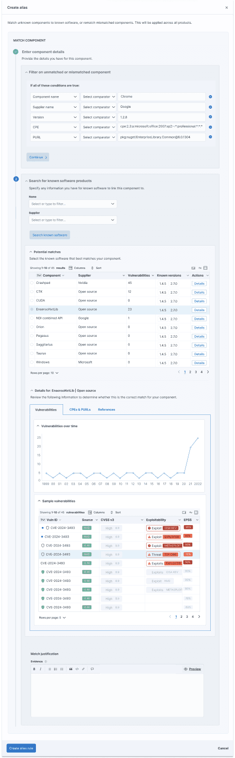 Users could create alias rules to automatically match a hard-to-identify component in existing and future SBOMs, drilling into the details about a possible match to ensure they were selecting the correct one. It is critical to identify components to have an accurate, complete view of risk.