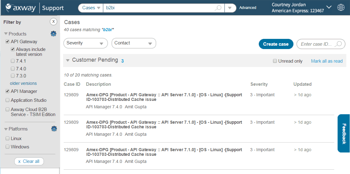 In the Cases area, users can filter cases by particular products, severity, and support agent. They can see each case's severity and when it was last updated. They can also view only unread updates or can mark all as read. An improvement to this would be bringing forth a summary of each update.